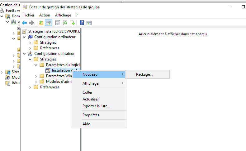 Sur la fenêtre ouverte, déroulez configuration utilisateur –> stratégies –> paramètre du logiciel. Faites un clic droit sur installation de logiciel –> nouveau –> package.