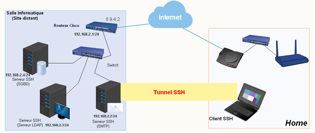 Vous l’aurez compris, nous allons devoir configurer le routeur Cisco à telle sorte que les serveurs privés (SSH) soient accessibles avec une seule adresse IP publique.