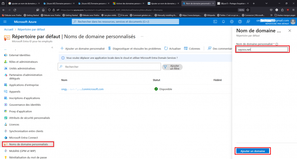 Après avoir créé votre compte sur Microsoft Azure, rendez-vous dans l’outil Microsoft Entra ID (anciennement Azure Active Directory), puis cliquez sur « Domaine personnalisé ». Sur la page ouverte, vous verrez qu’il y a déjà un domaine présent, de type « votreadressemail.onmicrosoft.com ». Cependant, comme nous l’avons souligné plus haut, nous allons configurer un nom de domaine personnalisé.