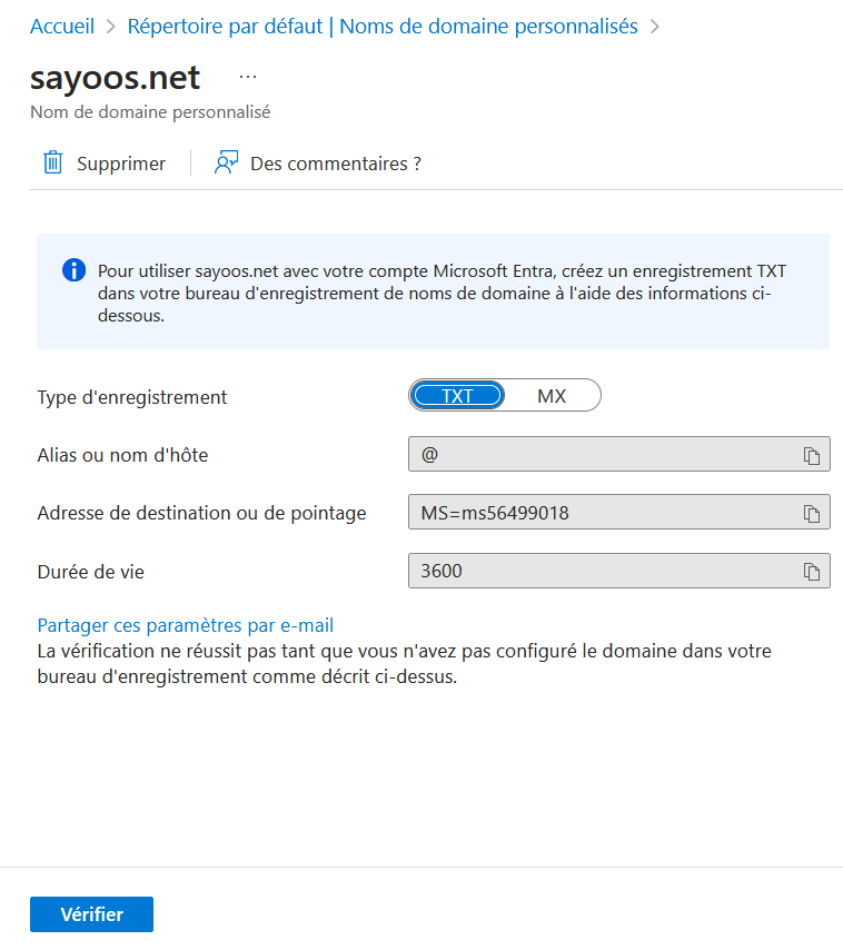 Ces informations permettent de créer un enregistrement chez votre fournisseur de nom de domaine afin de pouvoir utiliser pleinement votre nom de domaine avec Microsoft ENTRA ID.