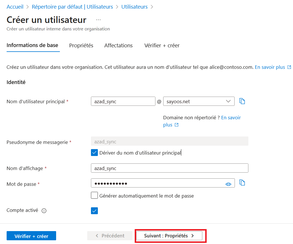 Sur la page ouverte, renseignez les informations du nouvel utilisateur, puis cliquez sur « Suivant : Propriétés ».