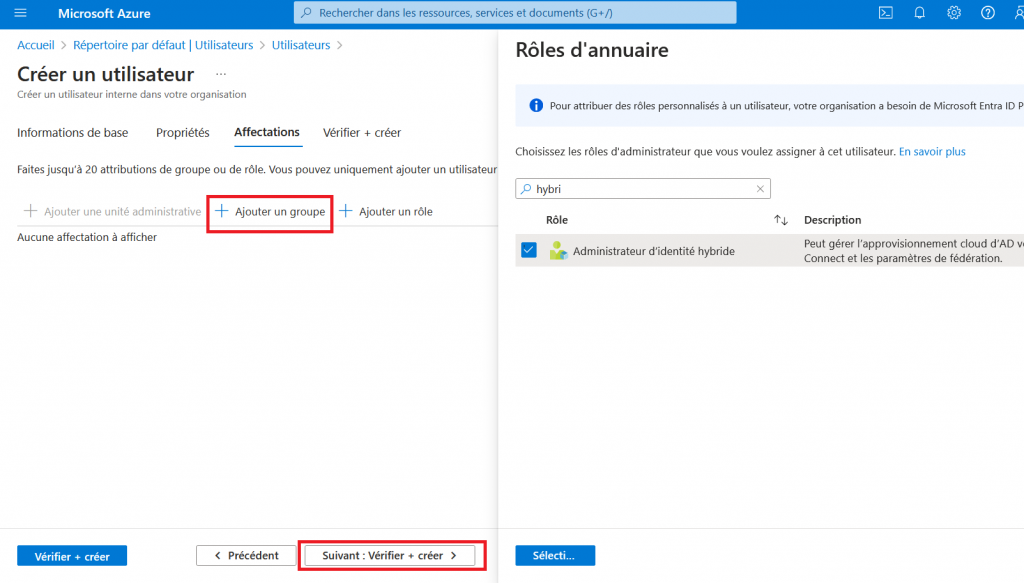Ensuite, cliquez sur « Ajouter un groupe », sélectionnez le groupe « Administrateur d’identité hybride » et cliquez sur « Suivant : Vérifier + créer », puis sur « Créer ».