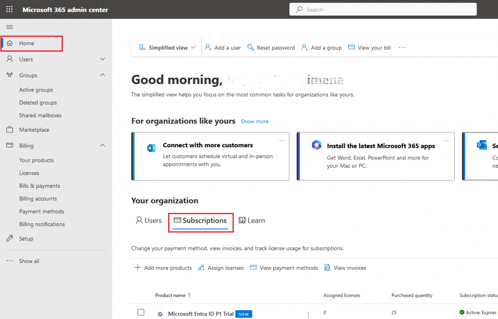 Sur le tableau de bord de la page d’accueil, cliquez sur « Subscription ».