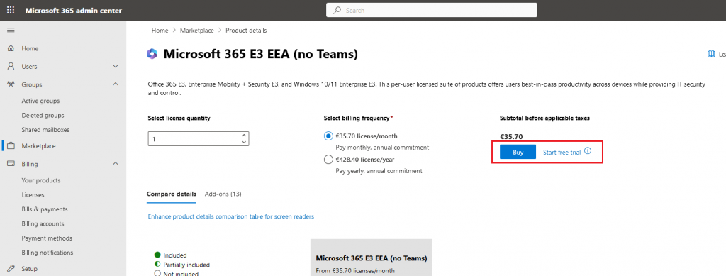Pour notre cas, saisissez « Office 365 », cliquez sur le produit correspondant, puis choisissez de l’acheter ou de le tester pendant quelques jours.