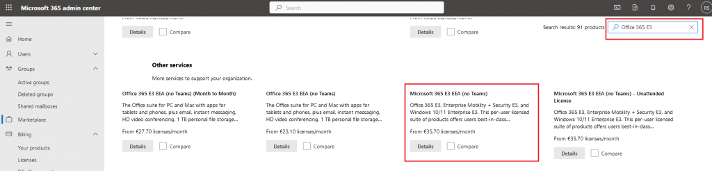 Répétez l’opération pour les autres licences (E1, E3, et E5).