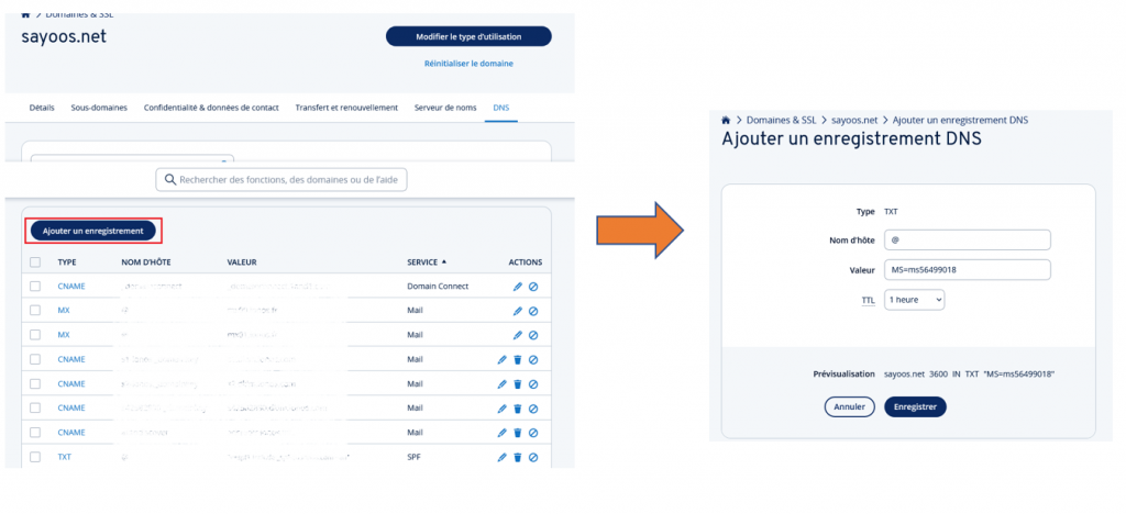 Notez ces informations, puis retournez chez votre hébergeur de nom de domaine (pour notre exemple, nous utilisons le panneau d’administration de l’hébergeur IONOS, voir images ci-dessous). Créez une nouvelle zone d’enregistrement de type « TXT », puis saisissez et validez ces informations.