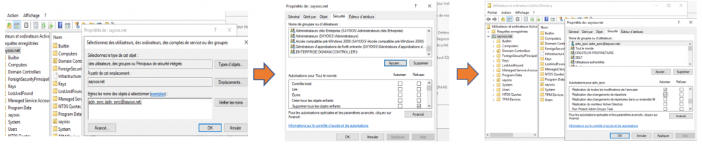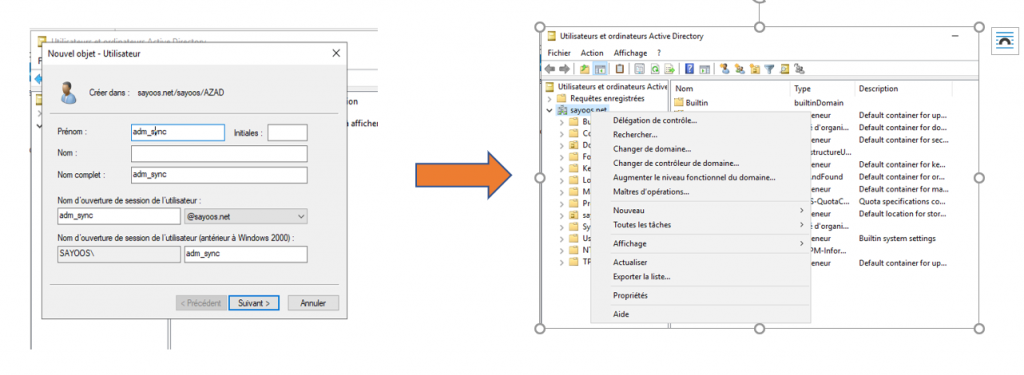 Ce compte permet de lire dans l’annuaire du domaine local pour ensuite récupérer et envoyer les groupes d’utilisateurs de l’annuaire local vers Microsoft ENTRA ID. Pour cela, créez un compte utilisateur au sein de l’AD, puis attribuez-lui les droits de réplication appropriés.