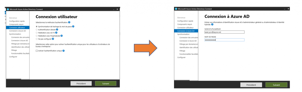 Sélectionnez l’option « Synchronisation de hachage du mot de passe », puis cliquez sur « Suivant ». À l’étape suivante, saisissez le compte ainsi que le mot de passe du compte de synchronisation que nous venons de créer dans Azure, puis cliquez sur « Suivant ».
