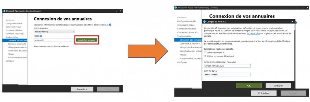 Configurez la connexion à l’annuaire en cliquant sur « Ajout d’un annuaire ». Sélectionnez l’option « Utilisez un compte AD existant », puis saisissez les informations du compte utilisateur que nous avons créé précédemment pour la lecture sur l’annuaire, puis cliquez sur « OK » et ensuite sur « Suivant ».