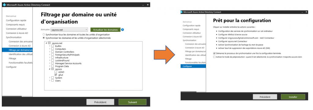 À l’étape de « filtrage par domaine ou unité d’organisation », sélectionnez l’OU contenant les groupes d’utilisateurs que vous souhaitez synchroniser (pour notre cas ça sera l’OU GHUT). Suivez les étapes jusqu’à l’étape d’installation et cliquez sur « Installer ».