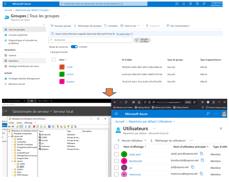 Une fois l’installation terminée, rendez-vous sur « Microsoft Entra ID >> Groupe ». Vous remarquerez la présence des groupes d’utilisateurs de l’AD local. Si des utilisateurs sont déjà présents au sein de ces groupes, vous pouvez les voir dans la catégorie « Microsoft Entra ID >> Utilisateurs ».