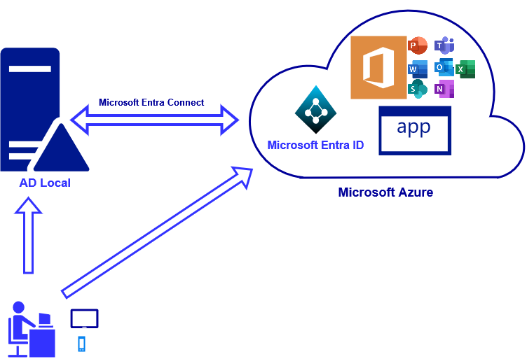 Nous avons une infrastructure hybride (en local et sur le cloud de Microsoft Azure) et nous souhaitons que les utilisateurs membres des groupes se voient attribuer automatiquement leurs licences respectives (Microsoft 365 Entreprise). Ils auront un mot de passe unique (SSO) pour la session et l’ensemble des produits Microsoft Office. Ceci leur permettra d’accéder aux outils collaboratifs en ligne (suite Office et applications de l’entreprise) depuis n’importe quel endroit et à partir de n’importe quel appareil (ordinateur, tablette et smartphone). Par exemple, les membres du groupe CODIR se verront attribuer des licences E5, ceux du groupe CONTRAT des licences E3, et ceux du groupe STAGIAIRE des licences E1. À cet effet, nous allons devoir installer et configurer notre infrastructure de A à Z, c’est-à-dire de la partie locale au cloud (Microsoft Azure).