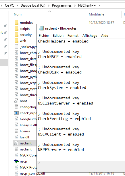 Une fois l’installation terminée, dirigez-vous vers le dossier de nsclient C:\Program Files\NSClient++ afin d’activer les sondes qui vont servir à faire remonter les informations des services de la machine à superviser (chargement du CPU, mémoire utilisée, etc..), au serveur de supervision. Ouvrez à cet effet le fichier nsclient.ini et remplacez les paramètres des sondes qui sont à l’état disabled par défaut par enabled, enregistrez et quittez.