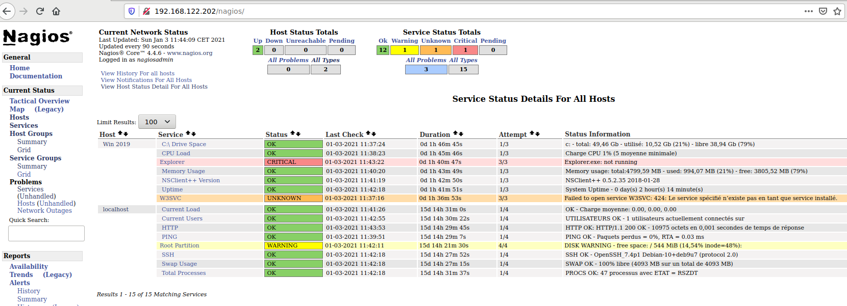 Redémarrez Nagios et allez vérifier sur le tableau de bord de ce dernier si tout fonctionne correctement. Normalement si Nagios redémarre sans retourner d’erreurs, cela voudra dire que tout fonctionne bien à priori.