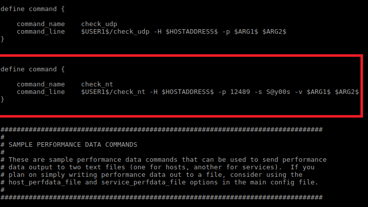 Avant toute chose, commencez par définir la commande check_nt , au sein du fichier commands.cfg se trouvant dans le dossier /usr/local/nagios/etc/objects comme ceci :