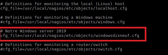 Activez le fichier que nous venons de créer (c’est-à-dire windowsdixneuf.cfg) en l’ajoutant dans le fichier de configuration de Nagios comme suit :