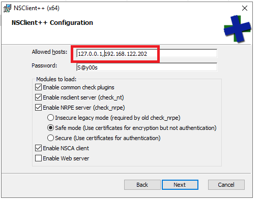 Saisissez l’adresse IP du serveur de supervision après celle de la boucle locale ; ensuite, pensez à saisir le mot de passe qui sera utilisé pour permettre à Nagios et NSclient++ de communiquer d’une manière sécurisée.