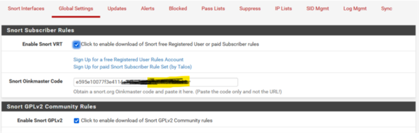 Sous l’onglet Global Settings, configurez les paramètres généraux de Snort. Ici, vous pouvez également entrer votre code Oinkmaster (c’est ce que nous allons faire) afin de pouvoir télécharger les mises à jour de la base de données des règles de Snort. Pour avoir ce fameux code, rendez-vous sur le site officiel de Snort pour créer un compte. Une fois votre compte activé, rendez-vous sur le menu et cliquez sur Oinkcode. Copiez le code afficher puis collez le dans le champ de texte « Snort Oinkmaster Code ».