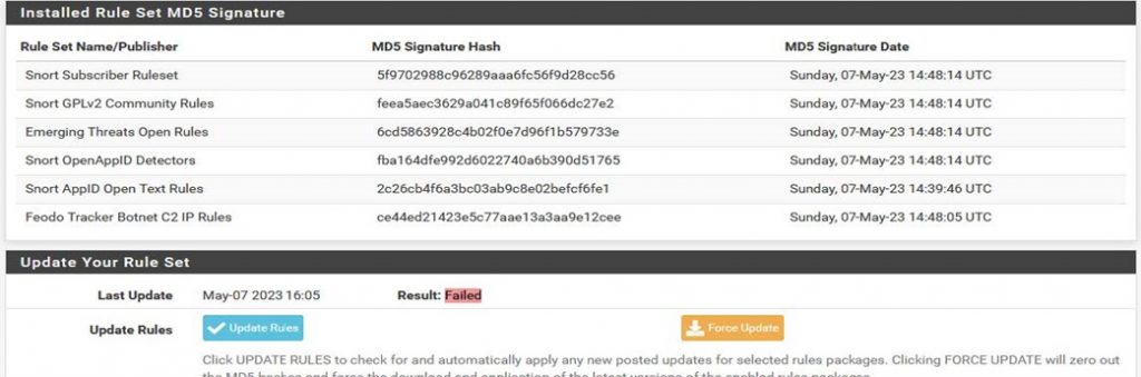 Cliquez ensuite sur Save pour enregistrer les paramètres. Sous l’onglet « Updates », cliquez sur « Update Rules » pour mettre à jour les Règles de Snort qui seront automatiquement télécharger sur les serveurs officiels de Snort.