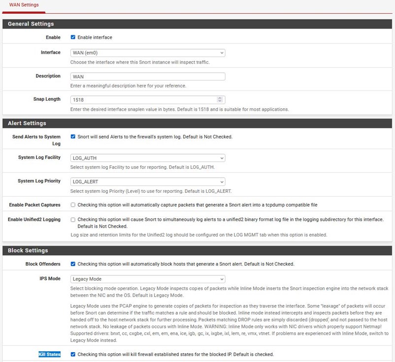 Une fois les mises à jour téléchargées, retournez sur « Services >> Snort >> Interfaces >> Snort Interfaces », afin d’activer l’interface à laquelle Snort devra écouter ainsi que la manière dont vous souhaitez que déployer Snort, en tant que IPS, IDS ou bien les deux. Pour notre cas ça sera l’interface WAN.