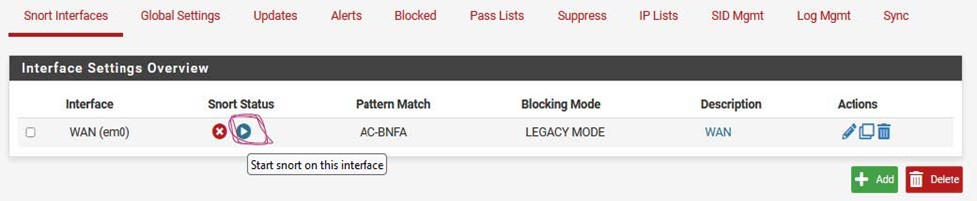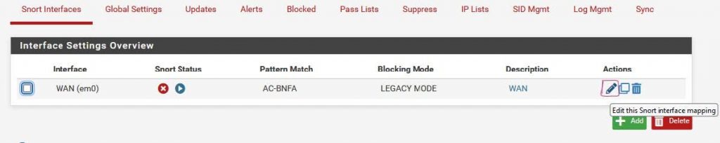 Pour ce faire rendez-vous dans Services >> Snort >> WAN – Interface Settings en cliquant sur le petit crayon qui permet d’effectuer des modifications.
