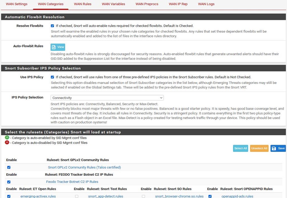 Enfin, vous pouvez activer ou non les règles qui ne sont pas activées par défaut afin qu’elles soient chargées au démarrage de Snort. Pour cela, cliquez sur « select All » puis « Save » et descendez tout en bas pour enregistrer les modifications en cliquant sur « Save ».