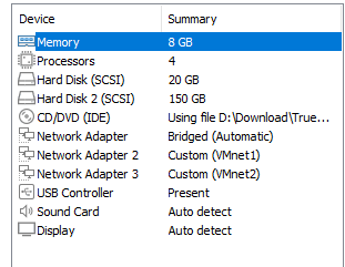 Sur Workstation PRO, créez une VM pour TrueNas, tout en respectant la configuration minimale que l’OS requiert (8 Go RAM, 2 CPU, 40GO DD …). Ajouter à cela les trois interfaces réseau comme prévu.