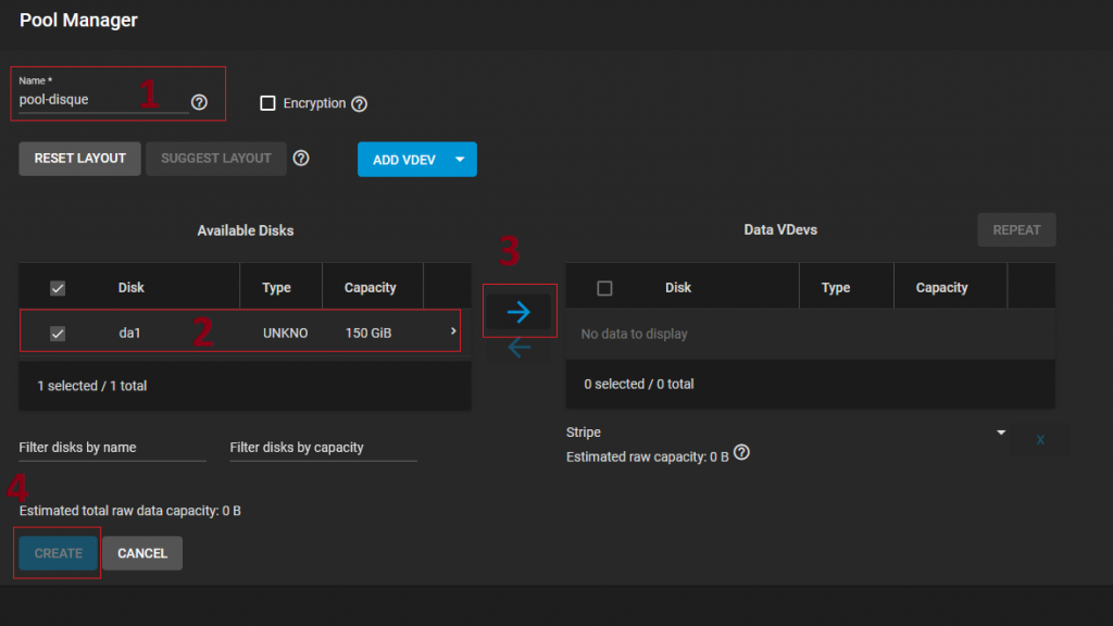 Entrez le nom du pool, sélectionnez le disque réservé à ce pool, puis cliquez sur la flèche en direction vers la droite, enfin cliquez sur Create pour valider la création du pool.