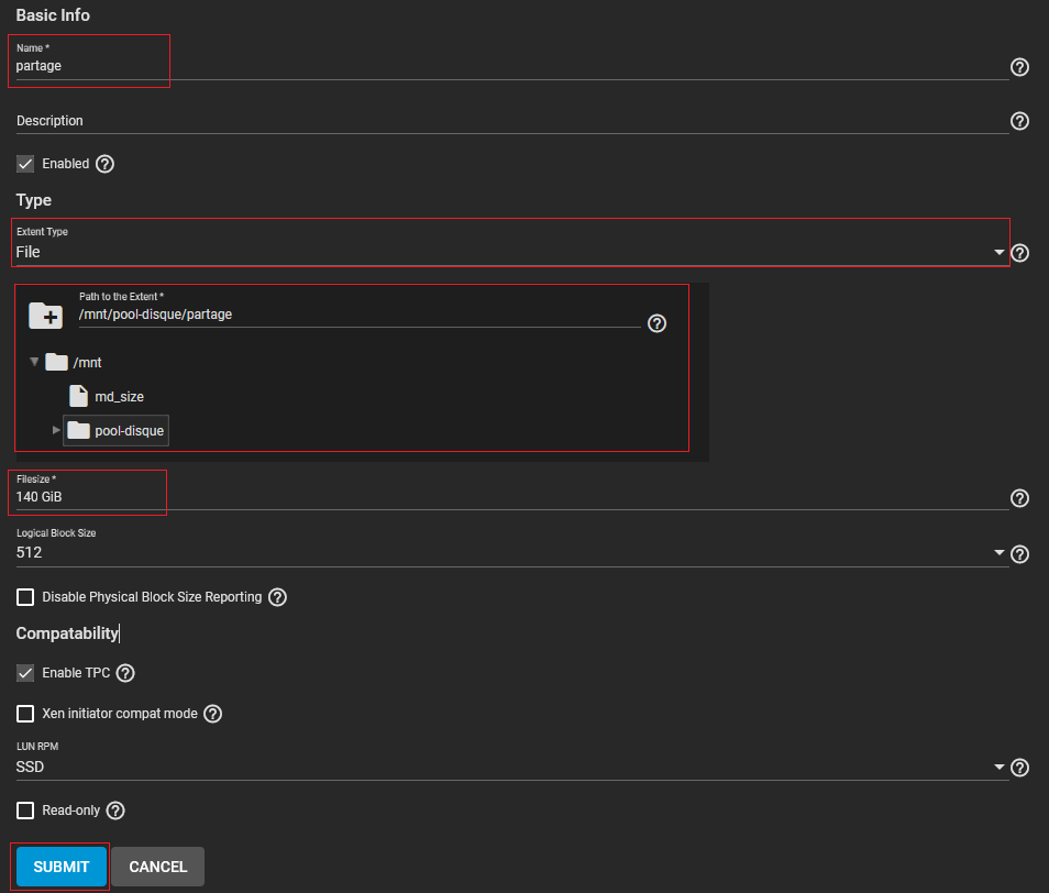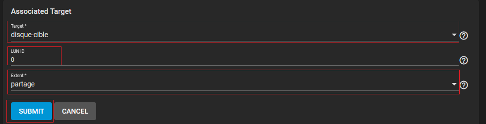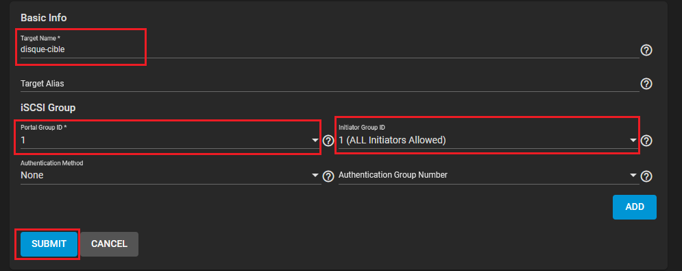Donnez un nom à la cible, sélectionnez l’ID de Portail Group et celle de l’Initiator Group et faites Submit.