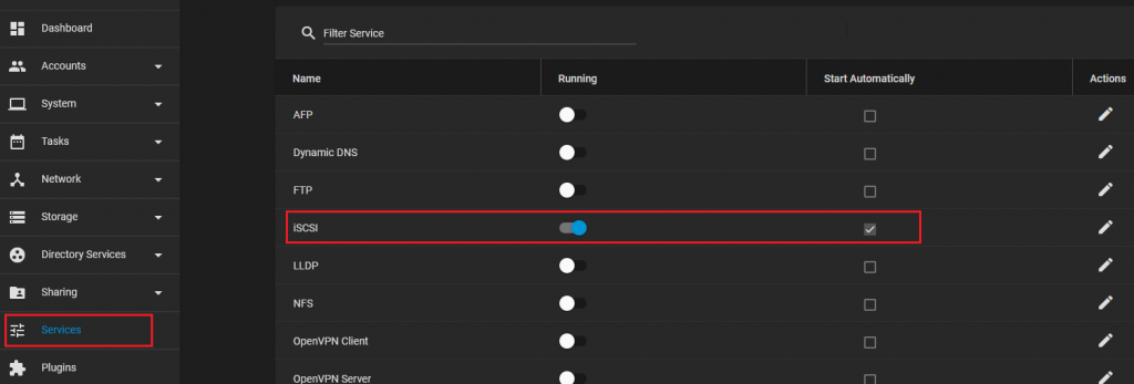 La création et la configuration du périphérique de stockage terminé, il ne nous reste plus qu’à nous rendre sur la page de configuration des Services en cliquant sur le lien du même nom sur la barre de menu.