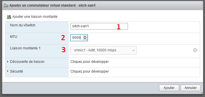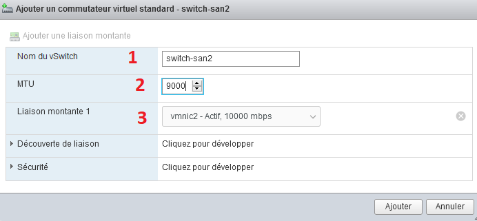 Pour créer les switches, rendez-vous sur Mise en Réseau –> Commutateurs virtuels des hôtes, puis cliquez sur ajouter un Commutateur virtuel standard. Donnez un nom au switch, mettez comme valeur MTU 9000 (valeur conseillée pour les réseaux de stockage ou traitement de données volumineuses), sélectionnez l’interface physique qui doit être liée au nouveau switch puis faites ajouter.