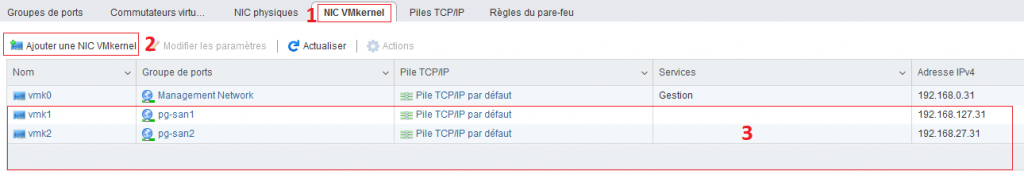 Les deux switches ainsi que leurs ports de groupes créés, il ne nous reste plus qu’à créer et configurer les interfaces virtuelles (NIC VMKernel). Pour ce faire, rendez-vous sur Mise en réseau –> NIC VMKernel, et cliquez sur Ajouter une NIC VMKernel.