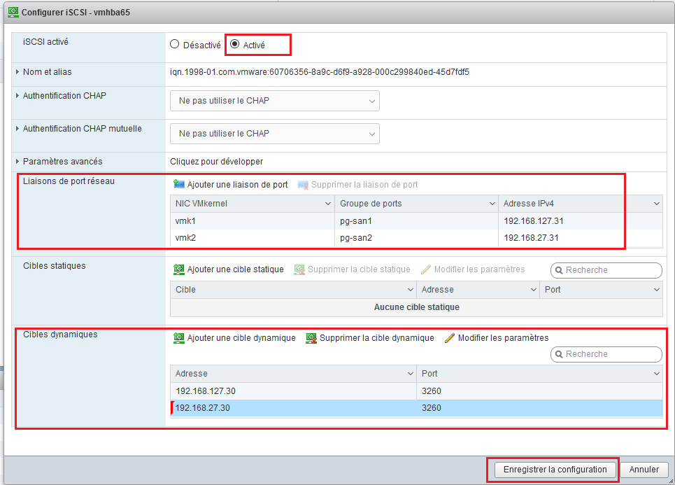 Sur la partie Cible dynamique, ajouter les deux adresses du serveur de stockage en cliquant sur Ajouter une cible dynamique.