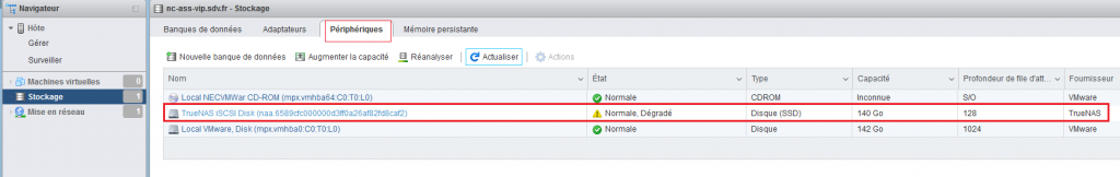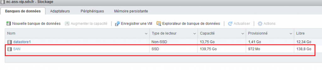 Notre nouvelle banque de données vient d’être créée. Dorénavant, à chaque création d’une VM au sein de cet hôte, vous aurez le choix entre la stocker sur le disque local (datastore) ou bien, sur le disque ISCSI que nous venons d’ajouter.