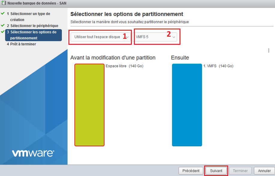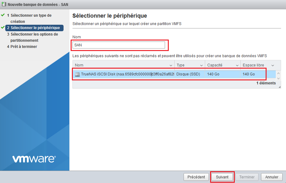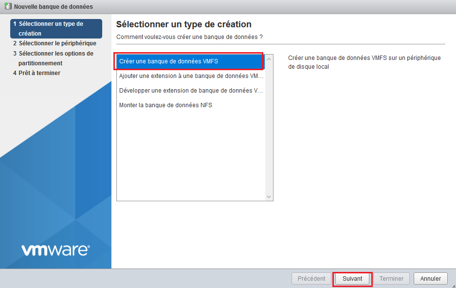 Sélectionnez l’option Créer une banque de données VMFS, ensuite cliquez sur Suivant. Donnez un nom à celle-ci puis faites Suivant. Sélectionnez le périphérique puis Suivant.