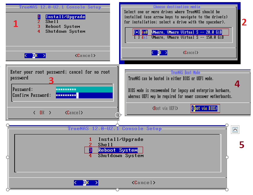Lancez le démarrage de la VM à partir de l’image ISO de TrueNas et suivez les étapes comme suit.