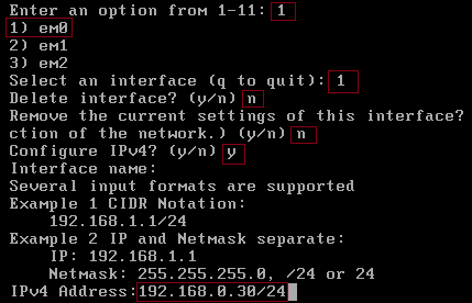 À cet effet, sur l’écran d’accueil (console setup), sélectionnez l’option n°1 (configure network interfaces) puis, faites Entrer pour valider.