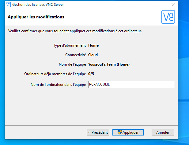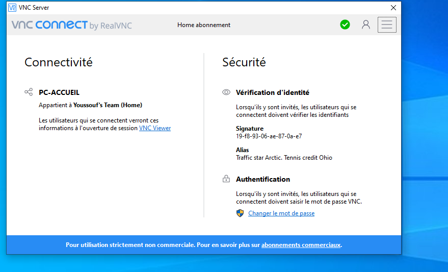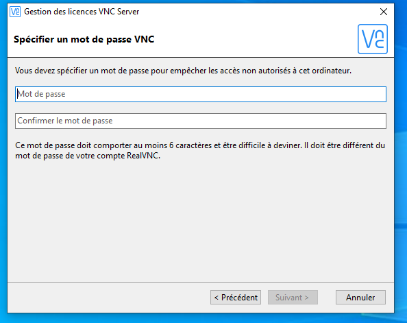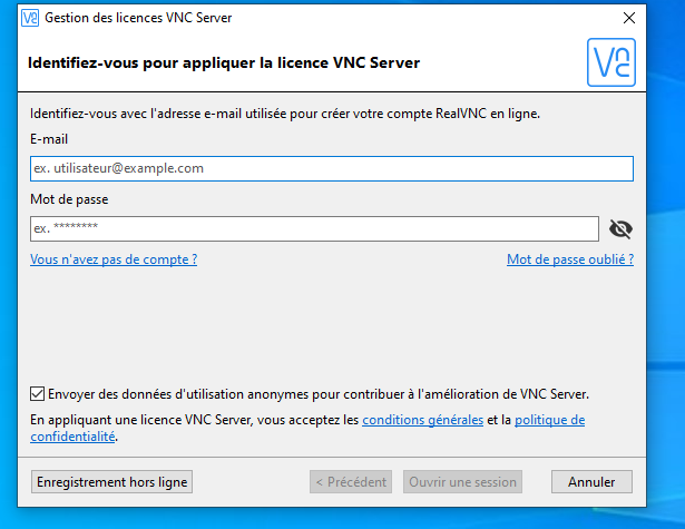 L’installation terminée, VNC Server doit être configuré pour qu’il soit fonctionnel. Cette configuration consiste à ouvrir une session avec le compte que vous avez créé sur le site de VNC afin d’activer la licence d’utilisation du programme liée à votre compte et par la suite créez un mot de passe qui sera demandé lors de la prise en main de cette machine.