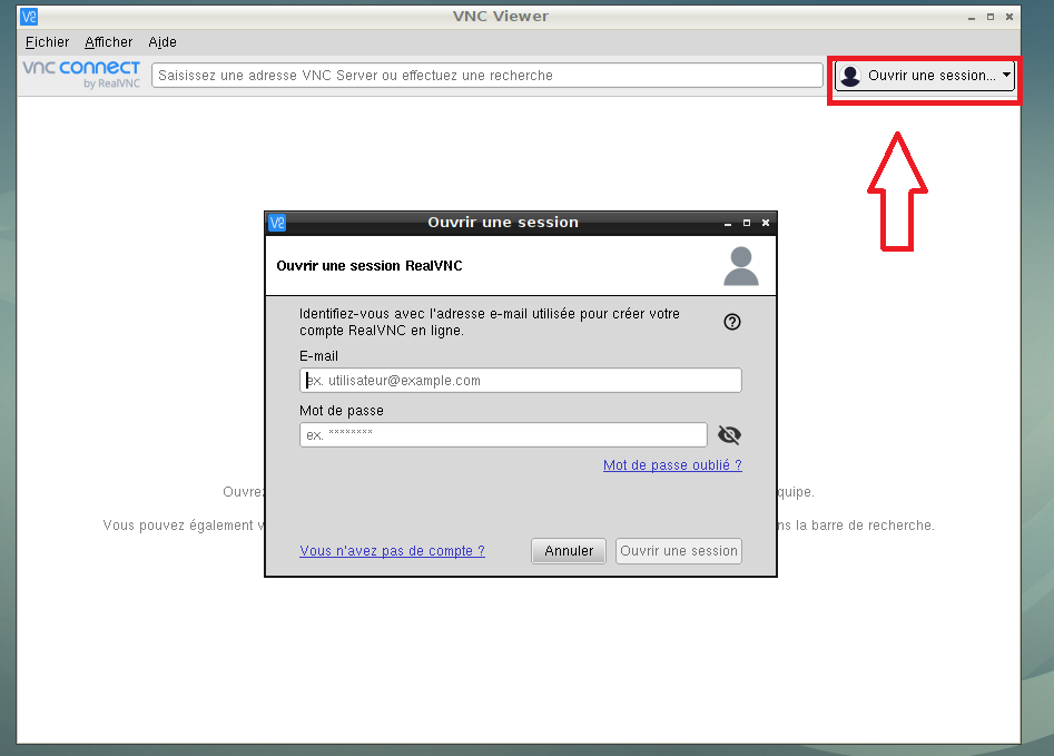 Sur le serveur, lancez VNC Viewer. Cliquez sur ouvrir une session, entrez ensuite les informations du compte que vous avez fourni au moment de votre enregistrement sur le site officiel de VNC. Une fois la session ouverte vous pouvez commencer à prendre la main sur les autres hôtes.