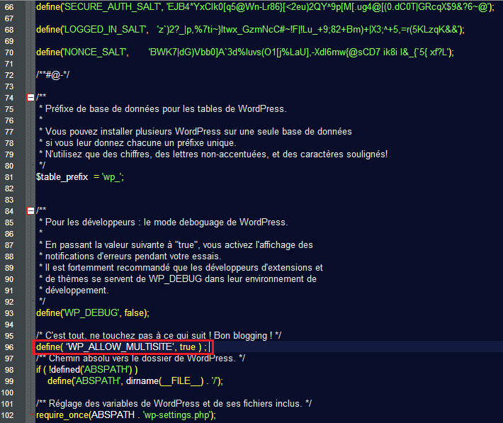 L’activation du mode multisite s’effectue en premier lieu par la copie d’un bout de code (en PHP) dans le fichier wp-config.php, qui se localise à la racine de votre serveur web. A l’intérieur de ce fichier wp-config.php, juste en dessous de la ligne commentaire « /* c’est tout, ne touchez pas à ce qui suit ! Bon blogging ! */ « , collez ceci : « define( ‘WP_ALLOW_MULTISITE’, true ) ; » et enregistrez le fichier.