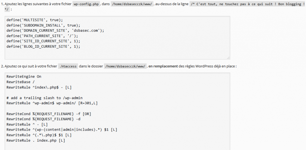 Sur la page suivante, celle ouverte après que vous avez sélectionné le bouton installer, veillez à recopier les lignes de code sur la première case et collez-les sur le fichier wp-config.php, juste en dessous de la ligne de code, celle servant à activer l’option multisite que nous venons de voir ci-avant « define( ‘WP_ALLOW_MULTISITE’, true ) ;« . Ouvrez ensuite le fichier .htaccess présent à la racine du site et ajoutez les lignes de code présentes sur la seconde case, en remplacement de celles déjà existantes. Juste en dessous, cliquez sur le lien se connecter, afin de vous reconnecter à l’espace d’administration de WordPress et, ainsi, de constater les nouveaux changements.
